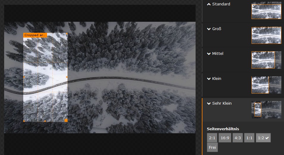 Damit die Bildausschnitte für die Kacheln schneller definiert werden können, wurde dem Bildausschnittsdialog die Seitenverhältnisse 2:1 und 1:2 hinzugefügt. Zur optimalen Bildausgabe können die Bildgrössen skaliert werden (siehe Seite Inhaltselemente-Bilder).