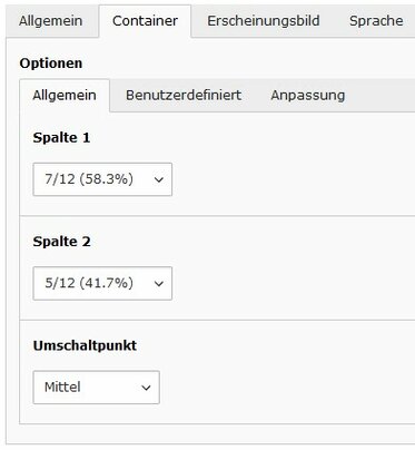 Die Standardspaltenbreite wird einfach über Auswahlfelder eingestellt. Weitergehende Anpassungen können im Tab "Benutzerdefiniert" vorgenommen werden. Siehe auch "Bootstrap grid options".