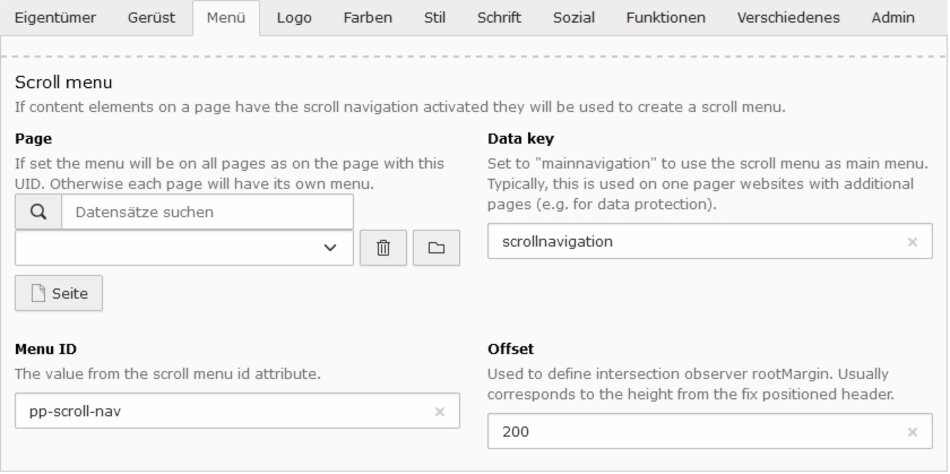 Den Inhaltselementen wurden Eigenschaften zur Erstellung eines Scrollmenüs hinzugefügt. Somit kann durch einfaches aktivieren der Scrollnavigation ein Eintrag dem Scrollmenü hinzugefügt werden. Der Menütext entspricht der Überschrift oder eines eigenen Textes. Bei Bedarf kann die Menüposition durch ein separates Feld bestimmt werden.