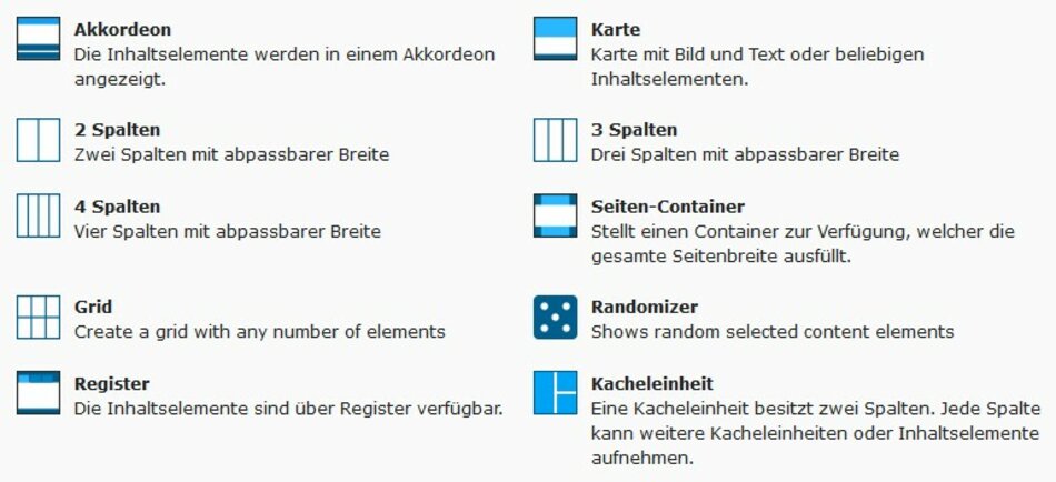 Mit Strukturelementen können Seitenbereiche feiner unterteilt werden. Typische Strukturelemente sind Spalten, Grid, Container, Register und Akkordeon.