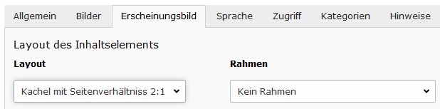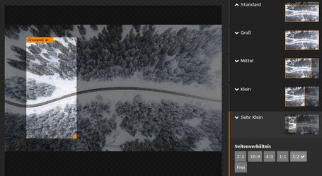 Damit die Bildausschnitte für die Kacheln schneller definiert werden können, wurde dem Bildausschnittsdialog die Seitenverhältnisse 2:1 und 1:2 hinzugefügt. Zur optimalen Bildausgabe können die Bildgrössen skaliert werden (siehe Seite Inhaltselemente-Bilder).